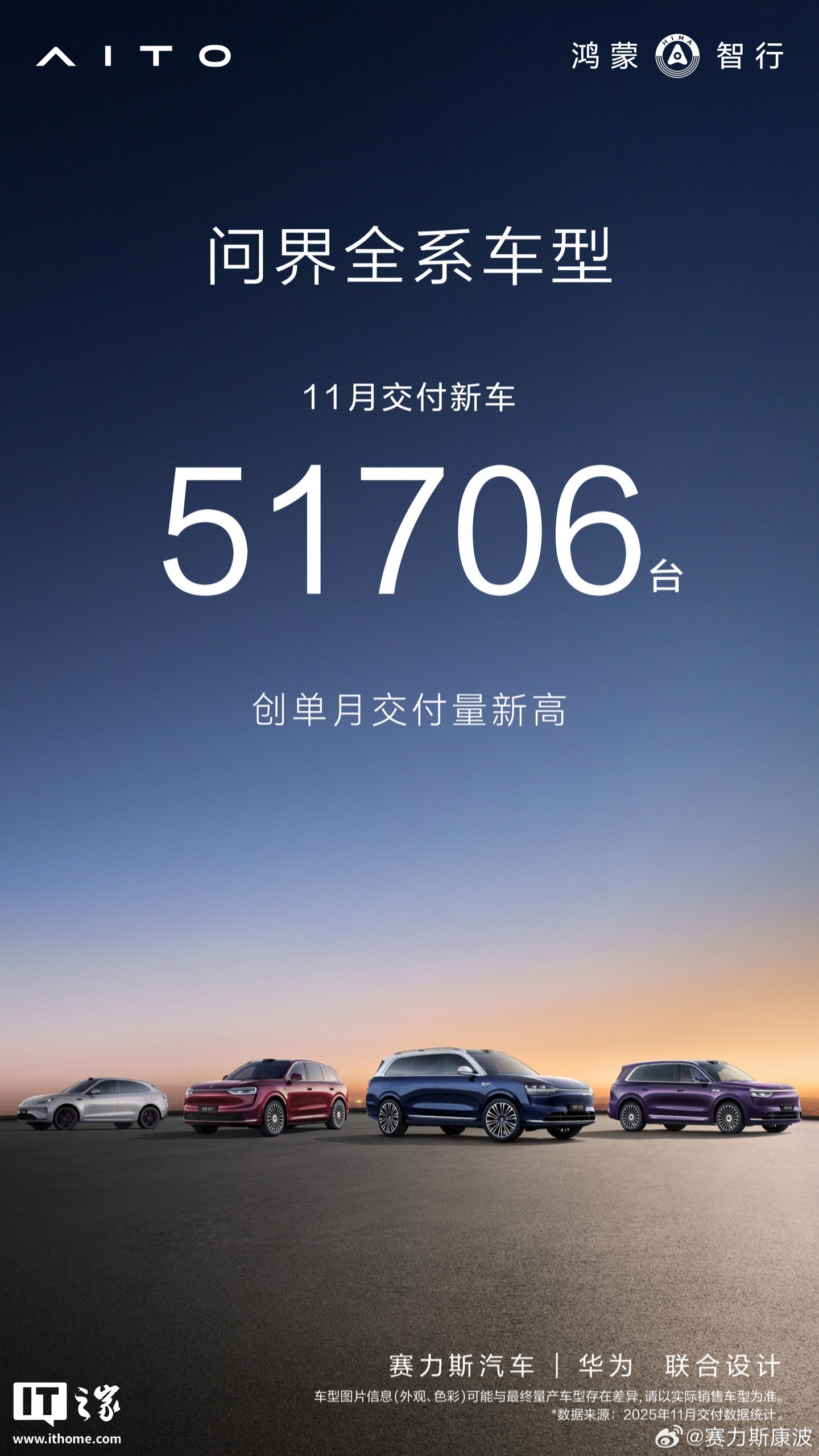 赛力斯集团副总裁康波 12 月 2 日发文透露,问界全系车型 11 月交付新车超 5 万台,创单月交付量新高。目前 AITO 问界系列车型累计交付突破 90 万辆: